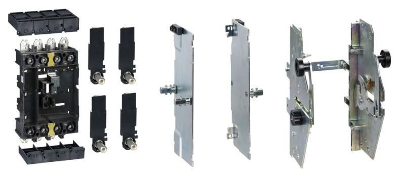 Комплект выкатного исполнения 4P (400–630) SE совместим исключительно с автоматическими выключателями Series SystemePact CCB. Установка возможна только на модели, предназначенные для стационарного монтажа. Процедура требует демонтажа старой базы и фиксации нового выкатного механизма на монтажной плате. Контактная система втычного типа обеспечивает надёжное соединение без инструментов - после вставки механизм защёлкивается механически. Для работы необходим доступ к тыльной стороне шкафа.