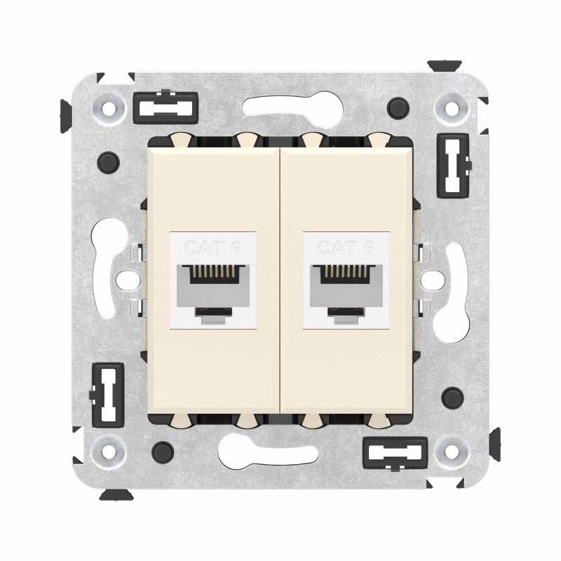 Розетка компьютерная RJ-45 без шторки в стену, категория 6, двойная, цвет Ванильная дымка от бренда DKC (ДКС), артикул 4405694 - это модульный элемент для скрытой проводки сети Ethernet в офисах, домашних рабочих зонах и серверных помещениях. Устройство обеспечивает надёжное подключение двух устройств одновременно, совместимо с кабелями Cat 6 и поддерживает высокую скорость передачи данных.