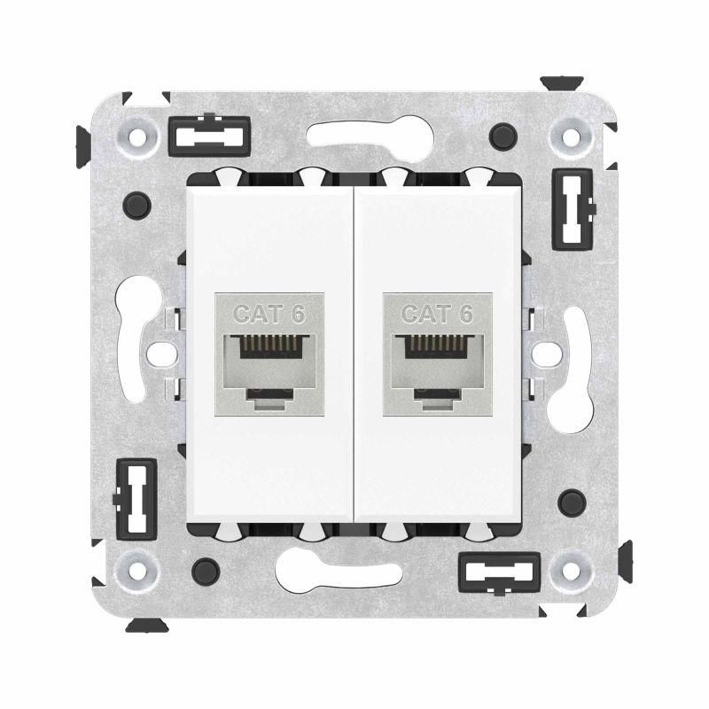 Розетка компьютерная RJ-45 без шторки в стену, категория 6, двойная экранированная используется для подключения устройств к локальным сетям - компьютеров, серверов, IP-камер, телефонов VoIP, принтеров и другого сетевого оборудования. Подходит для монтажа в стены жилых, офисных и промышленных помещений. Прямолинейный выход кабеля упрощает прокладку трасс и снижает риск перегибов. Комплектуется суппортом для фиксации внутри коробки, что делает её идеальной для интеграции в системы скрытой проводки.