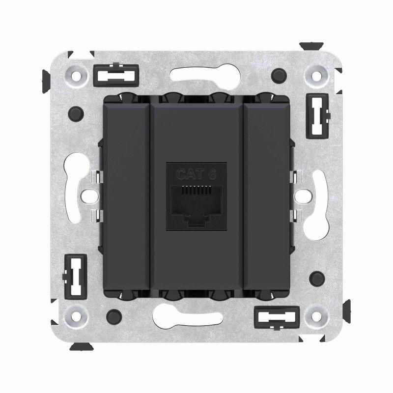 Розетка компьютерная RJ-45 кат.6 одинарная без шторки для скрытого монтажа, черный матовый применяется для подключения компьютеров, телефонов, IP-камер, принтеров и другого оборудования к локальной сети через патч-панели. Подходит для установки в системы организации рабочих мест: кабель-каналах, лючках, башенках, колоннах. Идеально для офисов, центров обработки данных, производственных помещений, где требуется чистый и защищённый доступ к сети.