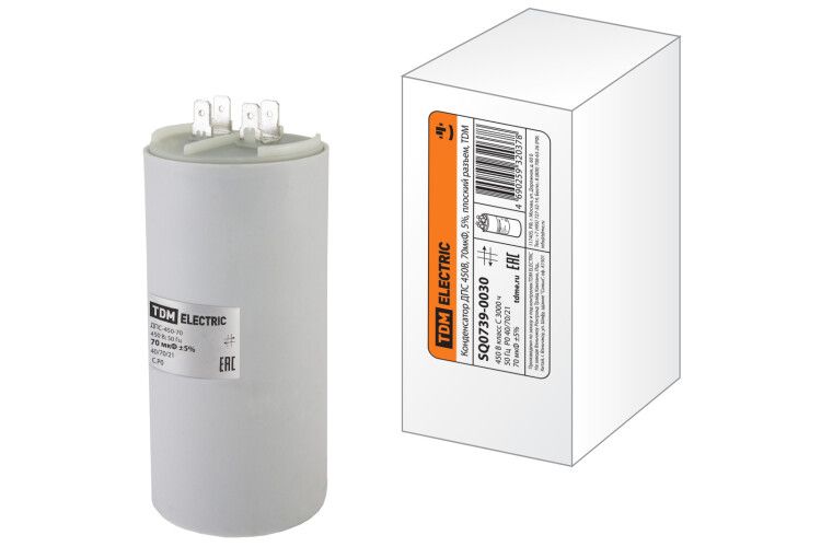 Конденсатор ДПС 450В, 70мкФ, 5%, плоский разъем SQ0739-0030 TDM ELECTRIC - это электрическое устройство, предназначенное для использования в различных механизмах и оборудовании, а также в бытовых приборах.