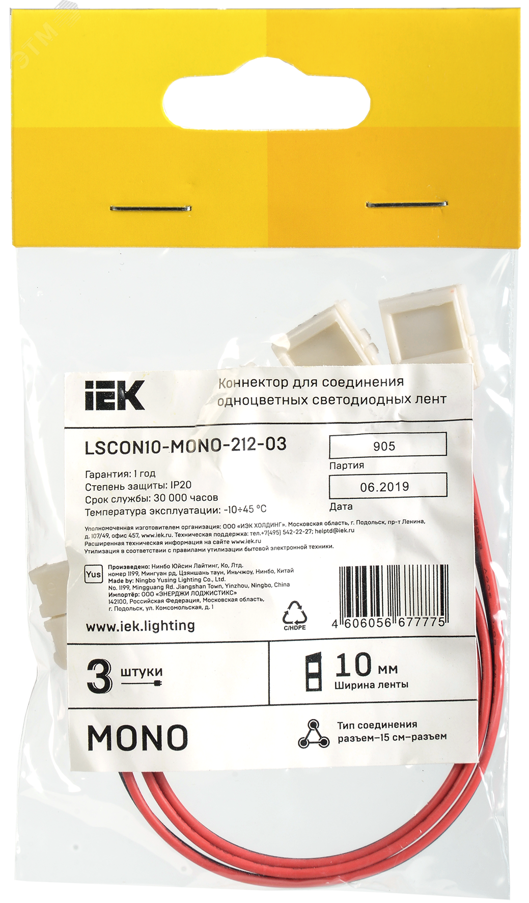 Коннектор MONO 10мм (разъем-15см-разъем) (уп.3шт) IEK LSCON10-MONO-212-03