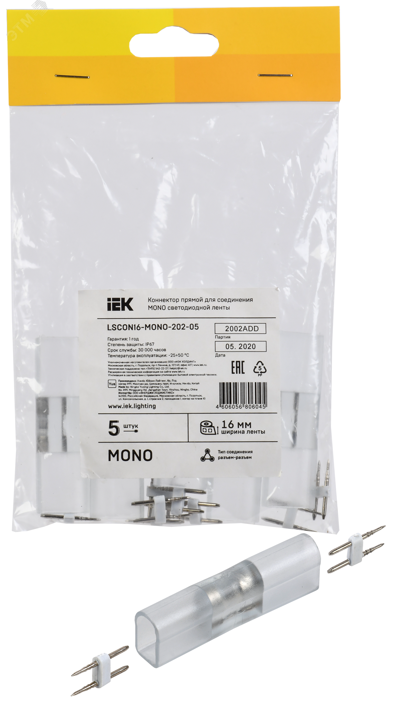 Коннектор MONO 16мм используется исключительно для соединения двух отрезков светодиодной ленты с шириной 16 мм. Он позволяет избежать пайки, что особенно удобно при монтаже в сложных местах - например, за подвесными потолками, внутри карнизов или вдоль плинтусов. Применяется в системах подсветки от IEK LIGHTING: для мебели, витрин, ниш, барных стоек и других элементов интерьера.