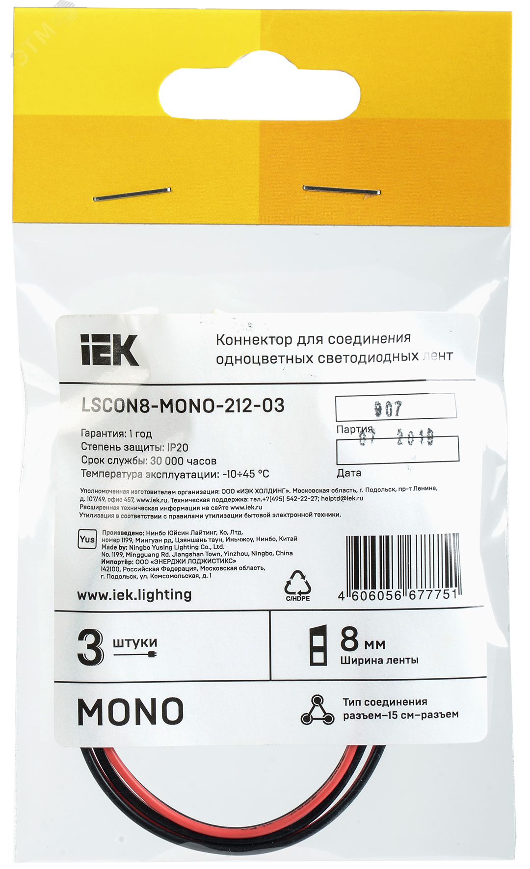 Коннектор MONO 8мм (разъем-15см-разъем) (уп.3шт) IEK LSCON8-MONO-212-03