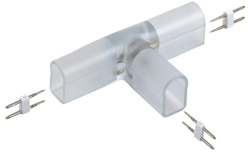 Коннектор Т-образный 16 мм используется для создания сложных световых контуров: поворотов, T-образных ответвлений, перекрёстков. Подходит для монтажа светодиодных лент в нишах, на потолках, вдоль стен, в мебели и декоративных системах освещения. Применяется там, где требуется сохранить целостность цепи без пайки - например, при замене участка ленты или изменении схемы освещения.