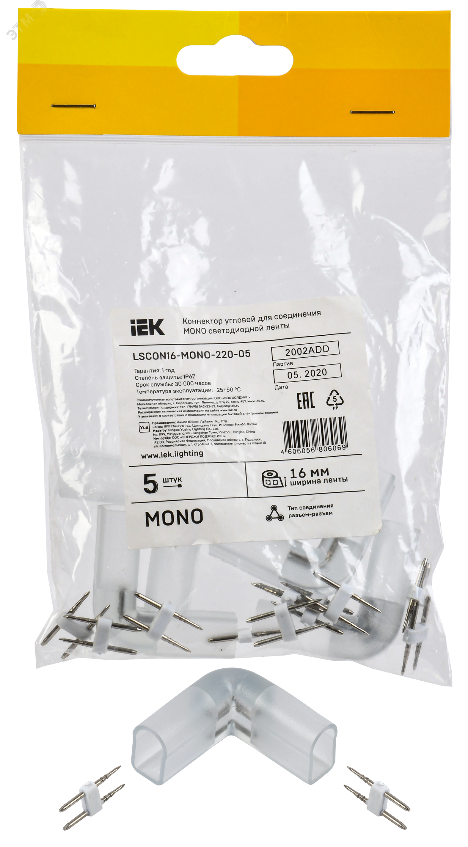 Коннектор угловой 16 мм (разъем-разъем) 5 шт от бренда IEK предназначен для надежного соединения отрезков светодиодной ленты 220 В под углом 90 градусов. Этот элемент из огнестойкого пластика подходит для монтажа в светильниках, нишах и декоративных подсветках, где требуется изменить направление светового потока. Артикул lscon16-mono-220-05 входит в серию LIGHTING и совместим с лентами IEK.