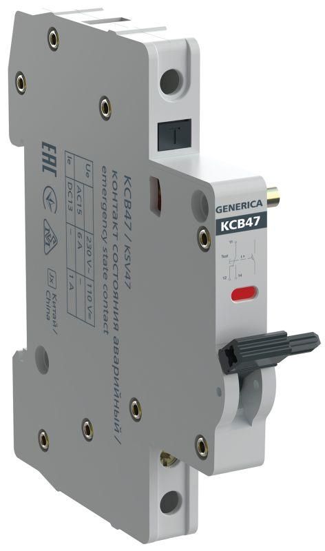 Контакт состояния аварийный КСВ47 для DIN-рейки от GENERICA и IEK предназначен для передачи сигнала о срабатывании автоматического выключателя из-за сверхтока. Устройство устанавливается на стандартную DIN-рейку и обеспечивает надёжную коммутацию в цепях управления и контроля.