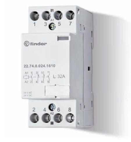 Контактор модульный 4 нормально-разомкнутых контактов 32А с серебряно-никелевыми контактами 240В переменного/постоянного тока 17.5мм IP20 с механическим индикатором от бренда FINDER (артикул 227402301410) предназначен для коммутации нагрузок до 32 А в распределительных щитах. Он сочетает компактную форму, надёжные контакты и наглядный индикационный механизм - идеален для автоматизации оборудования в промышленной и бытовой электросетях.