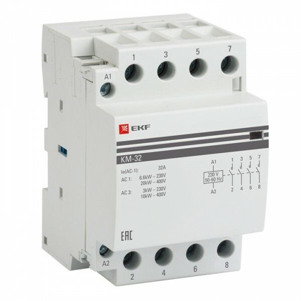 Контактор модульный EKF PROxima km-3-16-40 устанавливается на стандартную DIN-рейку шириной 35 мм. Для монтажа достаточно зафиксировать устройство на рейке до характерного щелчка. Подключение силовых проводов осуществляется к верхним и нижним зажимам - каждый полюс имеет два входа/выхода. Управляющая катушка подключается к двум контактам на передней панели (обозначены A1/A2). Максимальное сечение кабеля - 25 мм2; допускается использование как меди, так и алюминия. При сборке учитывайте глубину монтажа - 60 мм - чтобы обеспечить свободный доступ к клеммам и не перегружать шкаф.
