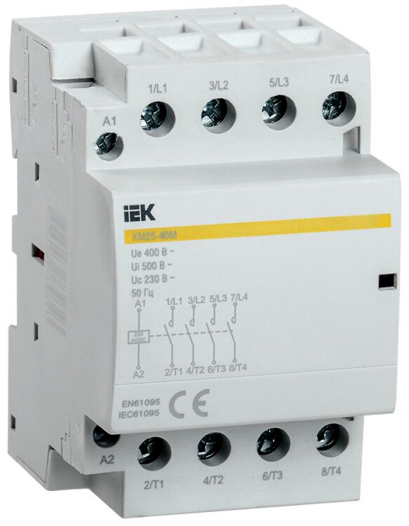 Контактор модульный КМ25-40М AC/DC 4 полюса совместим со всеми стандартными DIN-рейками 35 мм. Для монтажа достаточно вставить корпус в рейку и зафиксировать фиксатором сзади. Клеммы позволяют подключить одножильные и многожильные провода сечением до 10 мм2 - без предварительной опрессовки. Катушка управления рассчитана на 230 В - можно использовать как в сети переменного тока (230 В AC), так и в цепях постоянного тока (230 В DC). Обязательно проверьте соответствие напряжения питания катушки с источником управления - неверное подключение приведёт к отказу работы.