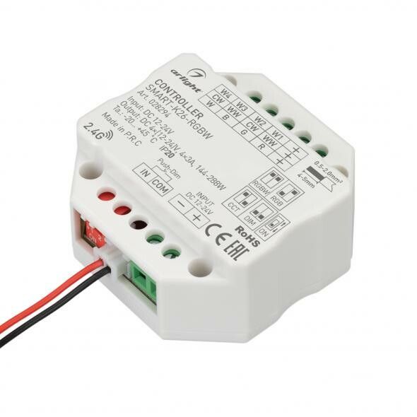 SMART-K26-RGBW совместим с пультами и панелями Arlight, работающими по протоколу 2.4 ГГц. Для установки используется встраиваемый способ - контроллер помещается в стандартный подрозетник 52×52 мм. Кабель подключается к винтовым клеммам: вход - питание (L/N), выход - четыре провода ленты (R/G/B/W). Напряжение питания должно соответствовать напряжению ленты (12 В или 24 В). Не используйте с лентами, требующими PWM-сигнал от микроконтроллера - этот контроллер выдаёт аналоговый уровень.