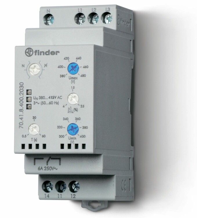 Контрольные реле 3-фазы, пониженное/повышенное напряжение, настраиваемые диапазоны, обрыв/чередование/асимметрия фаз, контроль нейтрали, ширина – 36мм, 1CO 6A - 704184002030 FINDER 70.41.8.400.2030