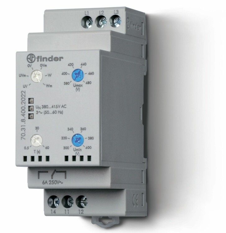 Контрольные реле 3-фазы, пониженное/повышенное напряжение, настраиваемые диапазоны, обрыв/чередование/асимметрия фаз, ширина – 36мм, 1CO 6A - 703184002022 FINDER 70.31.8.400.2022