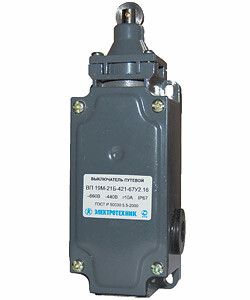 Выключатель путевой ВП19М-21Б-421-67 У2.15 используется для контроля положения движущихся механизмов. Он активируется при контакте с упором или деталью, которая давит на толкатель с роликом. Это позволяет автоматически разрывать или замыкать электрические цепи управления - например, останавливать двигатель при достижении крайнего положения, менять направление движения или запускать следующий этап цикла.