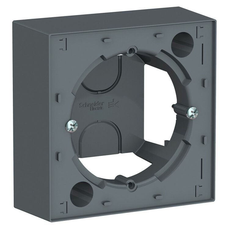 Коробка для наружного монтажа грифель совместима с модулями стандарта Schneider Electric серии AtlasDesign. Для монтажа используются саморезы (не входят в комплект) через отверстия на задней стенке. Крепление выполняется вертикально - фиксируется на плоской поверхности. Особенность: благодаря специальным соединителям (входят в комплект), несколько коробок можно последовательно соединять друг с другом, формируя многофункциональные блоки - например, группу выключателей или розеток без дополнительных распределительных коробок.