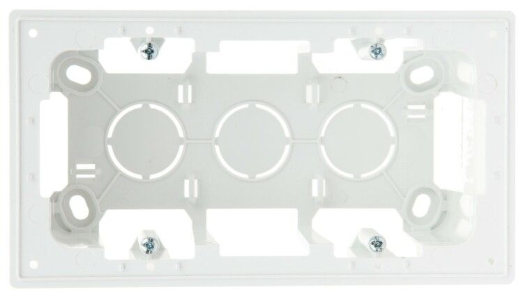 Коробка совместима со всеми стандартными двухпостовыми механизмами, имеющими крепление на расстоянии 70–75 мм между центрами отверстий. Для монтажа используются саморезы или дюбели (не входят в комплект). Кабели заводятся через подготовленные отверстия по бокам и снизу - перед сборкой их необходимо аккуратно выбить. Монтаж выполняется на ровную поверхность: дерево, бетон, кирпич, гипсокартон. Перед фиксацией проверьте соответствие глубины корпуса и высоты установленных устройств - некоторые механизмы требуют минимум 40 мм свободного пространства внутри.