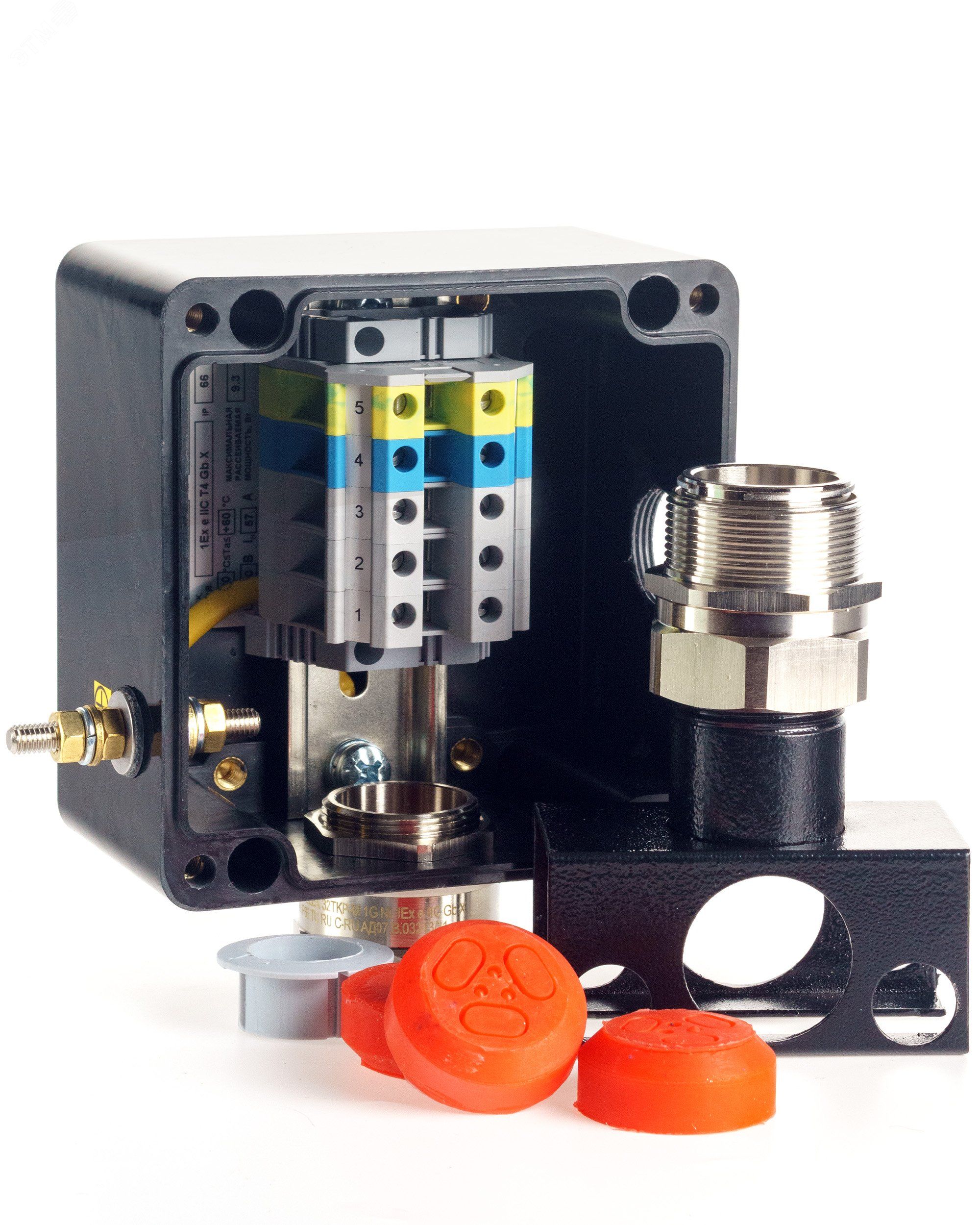 Коробка клеммная взрывозащищенная на основе модульного управляющего устройства серии MT с металлической опорой. Для подключения от 1 до 3-х плоских греющих кабелей или сигнальныхкабелей 1-3 мм , резьбовое отверстие под М25x1,5, колодка 5 модулей 10 мм2 - Extherm sborka 1PM/3D PTBO