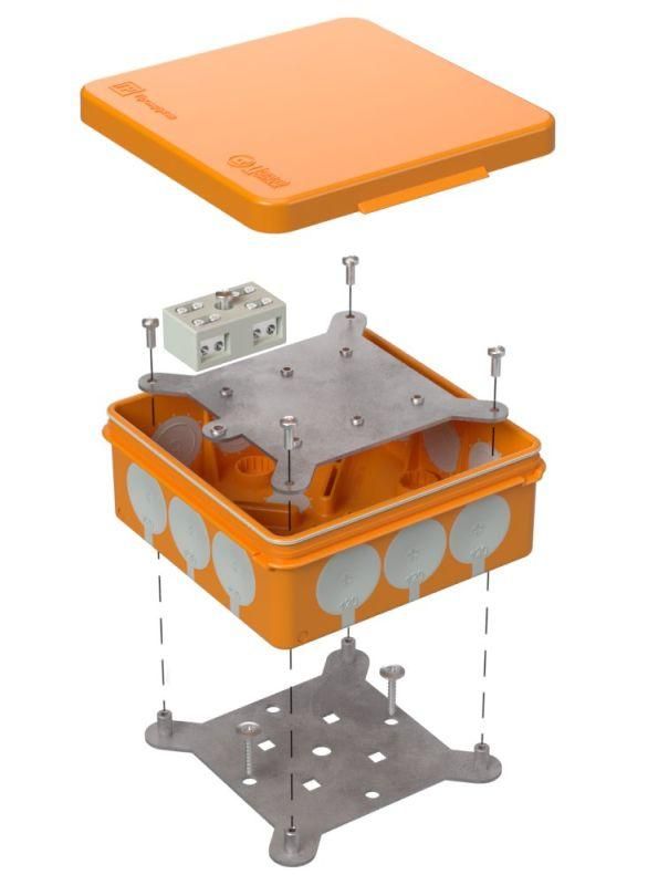 Коробка монтируется открытым способом - крепится на стену, потолок или металлическую раму с помощью болтов или саморезов через предварительно подготовленные отверстия. Установка возможна на любые прочные основания: бетон, металл, кирпич. Для герметизации входов используйте стандартные резиновые или термостойкие вводы подходящего диаметра. Крышка плотно закрывается защёлками - проверьте её положение после монтажа, чтобы исключить проседание.