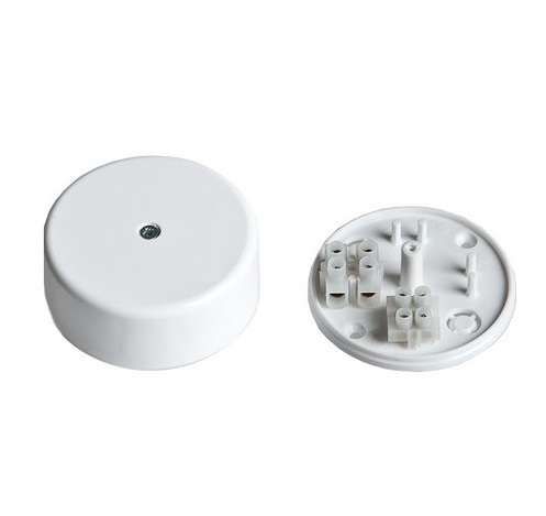 Коробка распаячная наружная D=62мм H=24мм, 2 или 4 клеммника, белая совместима с любыми одножильными и многожильными медными проводами сечением до 2,5 мм2, которые подходят под стандартные клеммы. Для монтажа требуется просверлить отверстия в стене, зафиксировать коробку дюбелями, затем подключить провода через входные отверстия и закрыть крышку винтами. Обязательно проверьте, чтобы провода не перегибались внутри - радиус изгиба должен быть не менее 5–8 диаметров жилы.