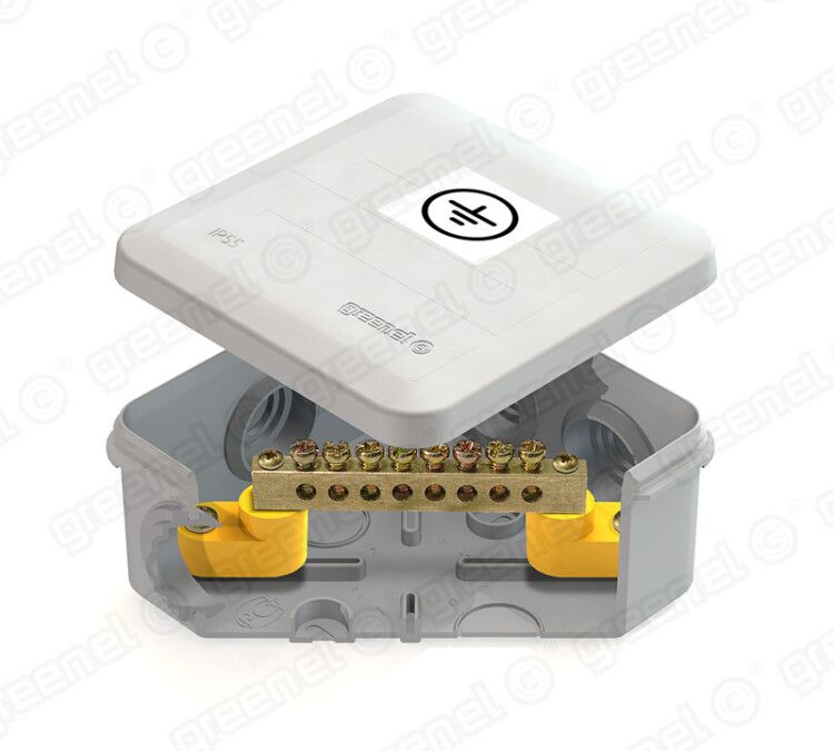 Коробка уравнивания потенциалов (КУП) 100х100х50мм, 6 гермовводов, с шиной 6х9 8груп, IP55, наклейка "заземление" | GE41361 GREENEL