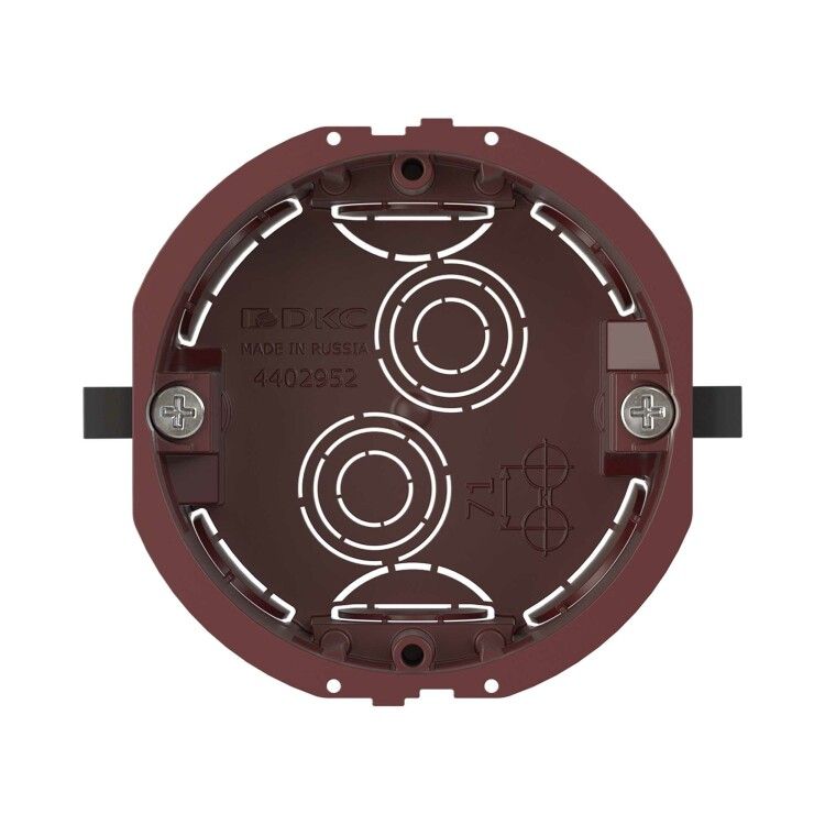 Подрозеточная коробка DKC Avanti 4402952 совместима с любыми стандартными электроустановочными изделиями, которые крепятся винтами или распорками. Монтаж выполняется в подготовленное отверстие в гипсокартоне. После установки коробка фиксируется распорными лапками, которые раздвигаются при затяжке винта. Для окончательной фиксации механизма потребуются два самореза 3×25 мм - они не входят в комплект. Удобно использовать в паре с соединителями DKC (продается отдельно) для создания блоков из нескольких коробок.