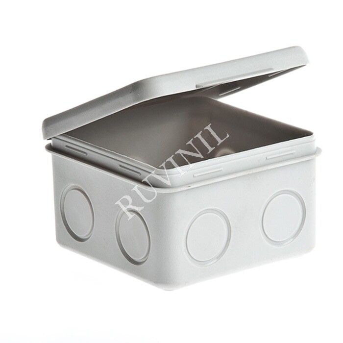 Коробка распаячная открытой установки 80х80х50 мм, откидная крышка, серый, IP54 от бренда Ruvinil (арт. 67039) предназначена для безопасного соединения и разветвления проводов при открытой электромонтажной системе. Изделие выполнено из ударопрочного пластика, устойчиво к перепадам температур и защищено от пыли и брызг воды.