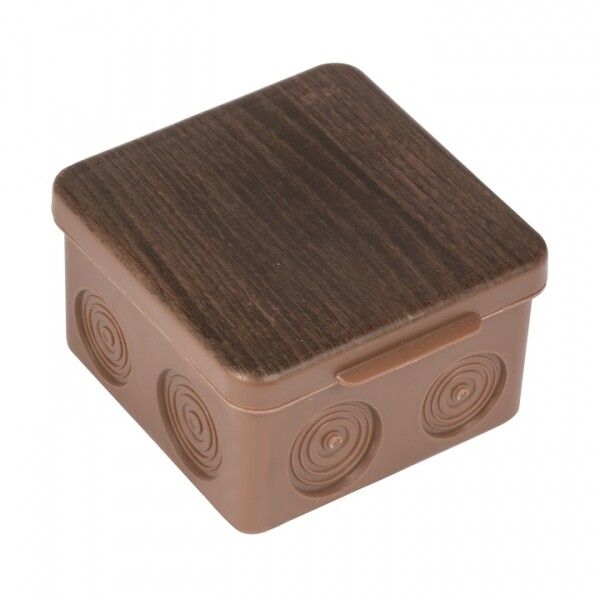 Коробка распаячная КМР-030-034 пылевлагозащищенная без мембранных вводов (100х100х55) тёмное дерево от бренда EKF из серии PROxima - это установочная коробка для скрытого монтажа электропроводки в интерьерах с декором под натуральное дерево. Её дизайн сочетает защитные функции с эстетикой, а материал обеспечивает надёжную работу в условиях повышенной влажности и перепадов температур.