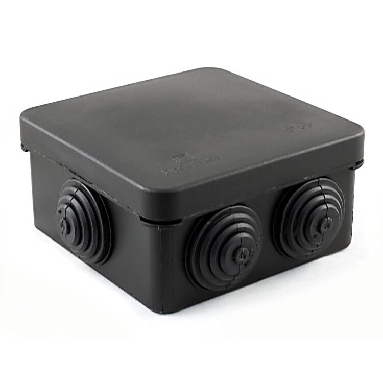 Коробка распределительная для открытой проводки безгалогенная (HF) черная 80х80х40 мм IP55 совместима с кабелями и трубами диаметром до 20 мм. Для монтажа используйте саморезы или дюбели - отверстия для крепления предусмотрены в основании корпуса. Крышка открывается без инструментов: просто надавите на край, чтобы освободить защелки. Вводы расположены по периметру, включая заднюю стенку - удобно для прохода кабелей от потолка или стены. Убедитесь, что внутреннее пространство достаточно для всех соединений: при использовании клемм WAGO или скруток с термоусадкой проверьте свободный объем - не перегружайте коробку более чем 5–6 проводами.