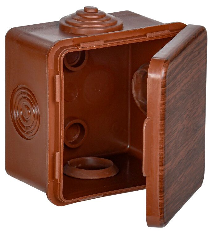 Коробка распределительная КМ 65х65х50мм наружного монтажа с откидной крышкой IP54 4 ввода дуб используется для организации точек соединения проводов и кабелей при наружном монтаже. Подходит для установки в жилых деревянных домах, банях, дачах и других объектах, где важна эстетика и защита от внешних воздействий. Применяется там, где требуется спрятать места ответвлений, сохраняя видимую отделку в тон древесины.