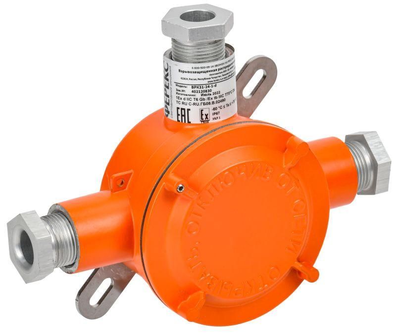 Коробка распределительная взрывозащищенная ВРК-31-24-1-d с 3 вводами используется для защиты мест соединений и ответвлений кабелей в зонах с повышенным риском взрыва. Подходит для установки там, где есть горючие газы, пары или пыль - например, на нефтегазовых объектах, химических заводах, элеваторах, угольных шахтах и производствах с пылеобразованием.