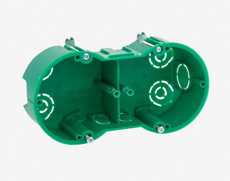 Коробка установочная КУП 2-х местная совместима с любыми стандартными лицевыми рамками 86×86 мм и устройствами с креплением на винты или распорки. Установка выполняется в подготовленную нишу в полой стене. Лапки фиксируются саморезами, которые затягиваются в материал перегородки - гипсокартон, деревянную обрешётку или ячеистый бетон. Отверстия для ввода кабеля легко пробиваются в задней стенке. Соединение нескольких коробок между собой возможно при помощи штатных выступов - это снижает количество точек входа кабеля и упрощает трассировку.