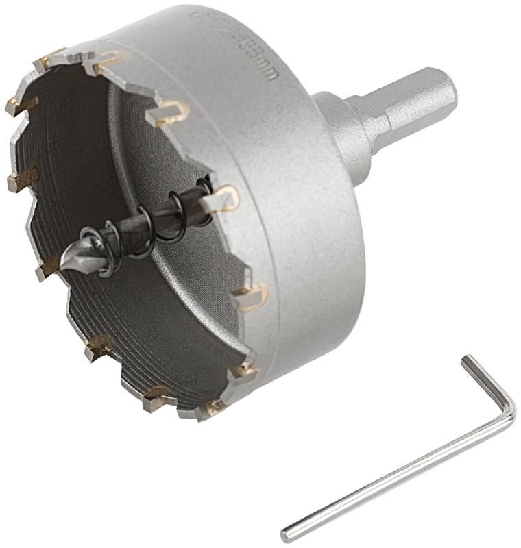 Коронка кольцевая с карбидными вставками для отверстий в нержавеющей стали 68 мм крепится через резьбу к шпindle электроинструмента. Для установки требуется совпадение резьбы - проверьте тип резьбы вашего сверлильного станка или перфоратора. Трехгранный хвостовик исключает проскальзывание в патроне, но требует наличия подходящего переходника или адаптера, если инструмент имеет цилиндрический патрон. Шестигранный ключ для фиксации центрального сверла входит в комплект - используйте его перед каждым запуском, чтобы избежать люфта.
