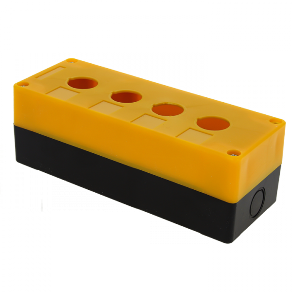 Корпус КП104 пластиковый 4 кнопки желтый служит для компактного размещения четырёх кнопочных выключателей - таких как стартеры, аварийные остановы или сигналы включения/выключения. Применяется в электрических щитах, пультах управления, на станках, конвейерах, лифтовых системах и других объектах, где требуется ручное управление с индикацией состояния.