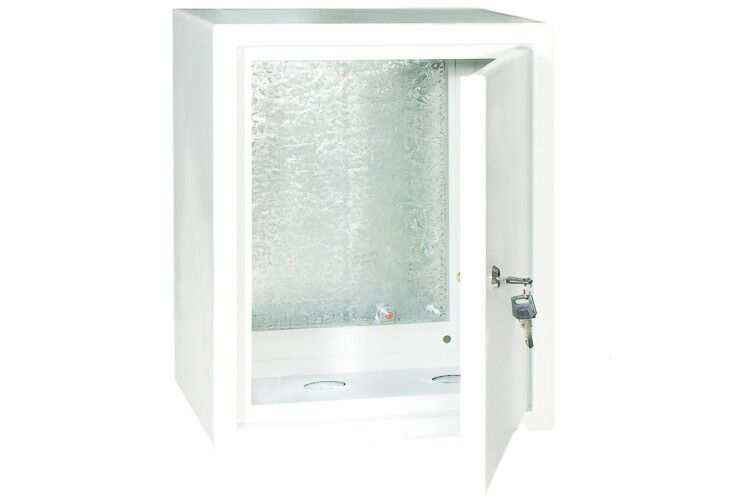 Количество отверстий для фланцев - 3, и он оснащен 3 линейными кабельными вводами. Толщина плиты шкафа составляет 1.2 мм. Корпус имеет защитное покрытие поверхности с порошковым покрытием и подходит для монтажа на стену.