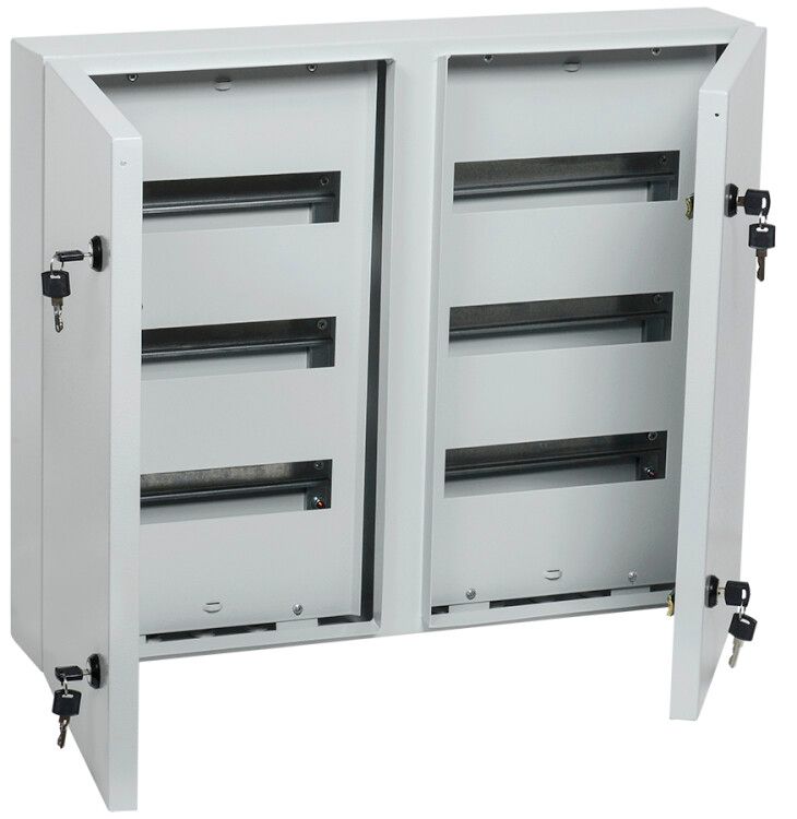 Корпус металлический ЩРн-72 совместим со всеми стандартными DIN-рейками и компонентами, соответствующими IEC 60715. Для монтажа используются предварительно подготовленные отверстия в задней стенке - крепление осуществляется на саморезы или анкеры. Двойная дверца открывается на 180°, что позволяет легко работать внутри щита даже при ограниченном пространстве. Установка допускается только на вертикальную поверхность из прочного материала (бетон, кирпич, ГКЛ с усиленным каркасом).