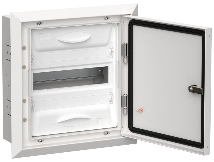 Корпус ЩРв-12 совместим со всеми стандартными модульными устройствами шириной 17,5 мм (по ГОСТ Р МЭК 60947-7-1). Для монтажа требуется подготовить нишу в стене с размерами не менее 390×375×140 мм - это обеспечит свободную установку с зазором для изоляции и проводов. Крышка крепится на шарнирах, открывается на 180°. Все клеммы и провода выводятся через предварительно просверленные отверстия в задней стенке - их можно увеличивать при необходимости. Не рекомендуется использовать для наружной установки или во влажных средах (ванна, баня, подвал).