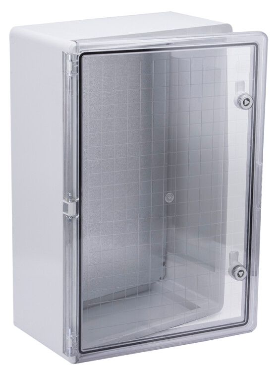 Корпус соответствует требованиям ГОСТ Р 50030.2 и IEC 60529 по степени защиты IP65. Конструкция исключает доступ к токоведущим частям при закрытой двери. Нагрузка на корпус не должна превышать допустимую массу оборудования - перегрузка может вызвать деформацию стенок. Прозрачная дверь изготовлена из поликарбоната, устойчивого к ультрафиолету и механическому воздействию.