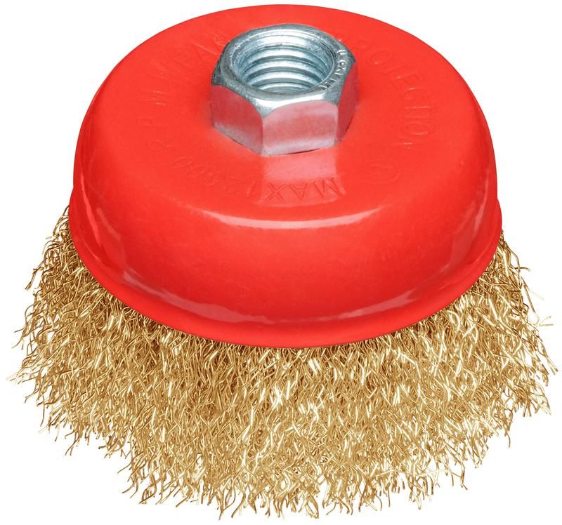 Корщетка-чашка гайка М14 стальная латунированная волнистая проволока 75мм блистер КУРС 39092