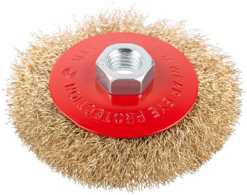 Корщетка-колесо с наклоном гайка М14 стальная латунированная волнистая проволока 100мм блистер КУРС 39083