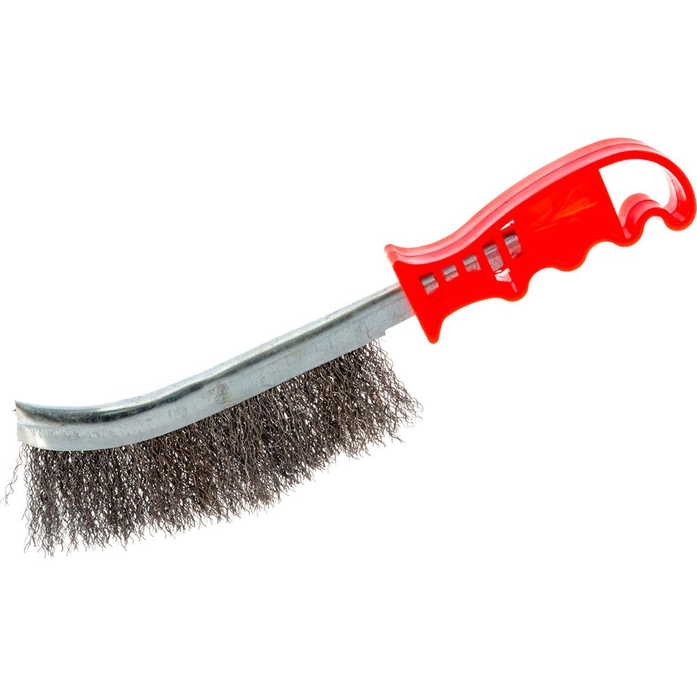 Корщетка с изогнутой пластиковой ручкой стальная тип А используется для удаления коррозии, остатков покрытий, грязи и оксидов с поверхности металла, бетона, камня и других жёстких материалов. Применяется в ремонтных мастерских, на производстве, при обслуживании оборудования, трубопроводов, рам, фланцев и деталей после сварки. Особенно эффективна там, где требуется доступ к труднодоступным зонам благодаря изогнутой форме рабочей части.