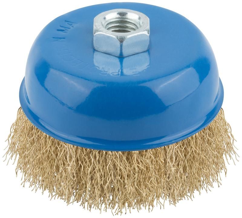 Корщетка тип "чашка" гайка М14 стальная латунированная волнистая проволока 100мм MOS 38943М