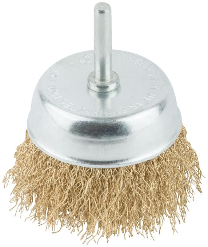 Корщетка тип "чашка" со штифтом стальная латунированная волнистая проволока 75мм MOS 38488М