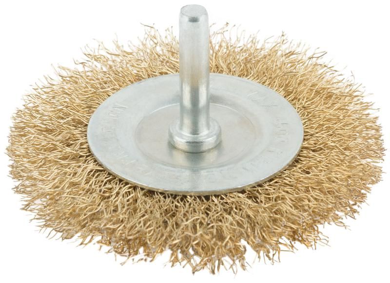 Корщетка тип "колесо" со штифтом стальная латунированная волнистая проволока 75мм MOS 38484М