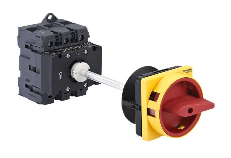 Выключатель-разъединитель SE MSD80340R - устройство для безопасного отключения и коммутации силовых цепей до 80 А, предназначенное для установки на DIN-рейку или монтажную плату. Красная выносная рукоятка с замком обеспечивает визуальную сигнализацию состояния и возможность фиксации в положении «выключено». Применяется в распределительных щитах промышленного оборудования.