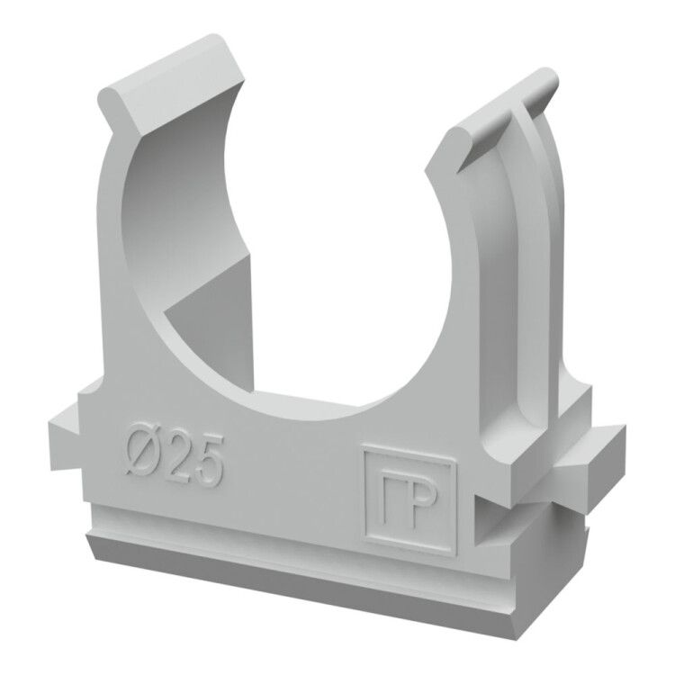 Держатель для труб (клипса) диаметр 25 мм АБС-пластик серый от бренда ПРОМРУКАВ (арт. pr.0625) предназначен для надежного крепления одиночных труб наружным диаметром 25 мм к вертикальным и горизонтальным поверхностям. Простой, компактный и устойчивый к механическим нагрузкам элемент, подходящий для систем с гладкими ПВХ-трубами и гофрированными аналогами.