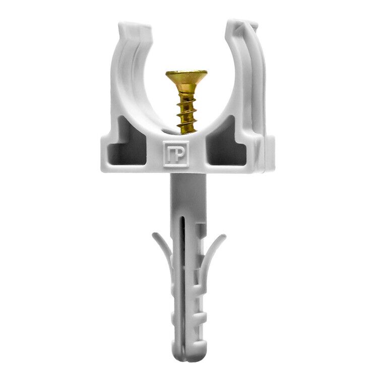 Крепеж-клипса с дюбелем и саморезом d20мм серая используется для крепления гладких труб из ПВХ или гофрированных труб одного диаметра - 20 мм - к стенам, потолкам, полу или внутренним перегородкам. Подходит для открытой прокладки коммуникаций в жилых, офисных и промышленных помещениях. Часто применяется в системах водоснабжения, канализации, вентиляции и слаботочных сетях.