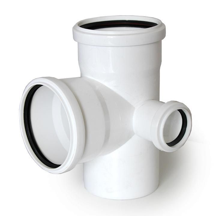 Крестовина двуплоскостная правая МК МПП 110/110/50х87 белая RTP - соединительный элемент из полипропилена для сборки трубопроводных систем с пересечением двух основных направлений и бокового ответвления. Применяется в канализационных и дренажных сетях, где требуется изменение направления потока с сохранением пропускной способности.