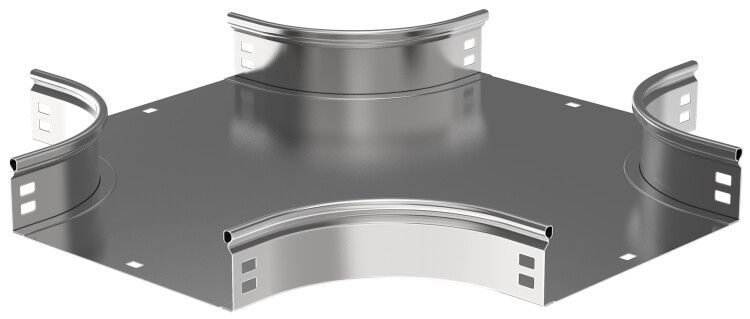Крестовина плавная тип Г01 ESCA 50х200мм используется для создания четырёхстороннего перехода между кабельными лотками под углом 90°. Она позволяет изменить направление трассы без резких изгибов, снижая механическую нагрузку на кабели. Применяется в системах распределения электроэнергии на заводах, в цехах, на транспорте и в других объектах с жесткими условиями эксплуатации.
