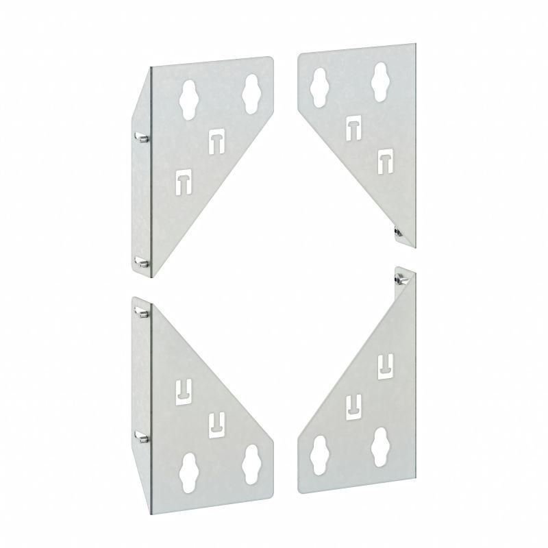 Кронштейн для крепления PDU ZERO U устанавливается на вертикальные направляющие каркаса шкафа IT-CQE. Каждый кронштейн крепится двумя пластинами - одна фиксируется на передней части рамы, вторая - на задней. Это создаёт жёсткую опору без нагрузки на стенки корпуса. Установка выполняется без сверления: достаточно зафиксировать пластины болтами через стандартные отверстия в профилях шкафа. Для правильной сборки используйте весь комплект из четырёх пластин - две на каждый борт шкафа.