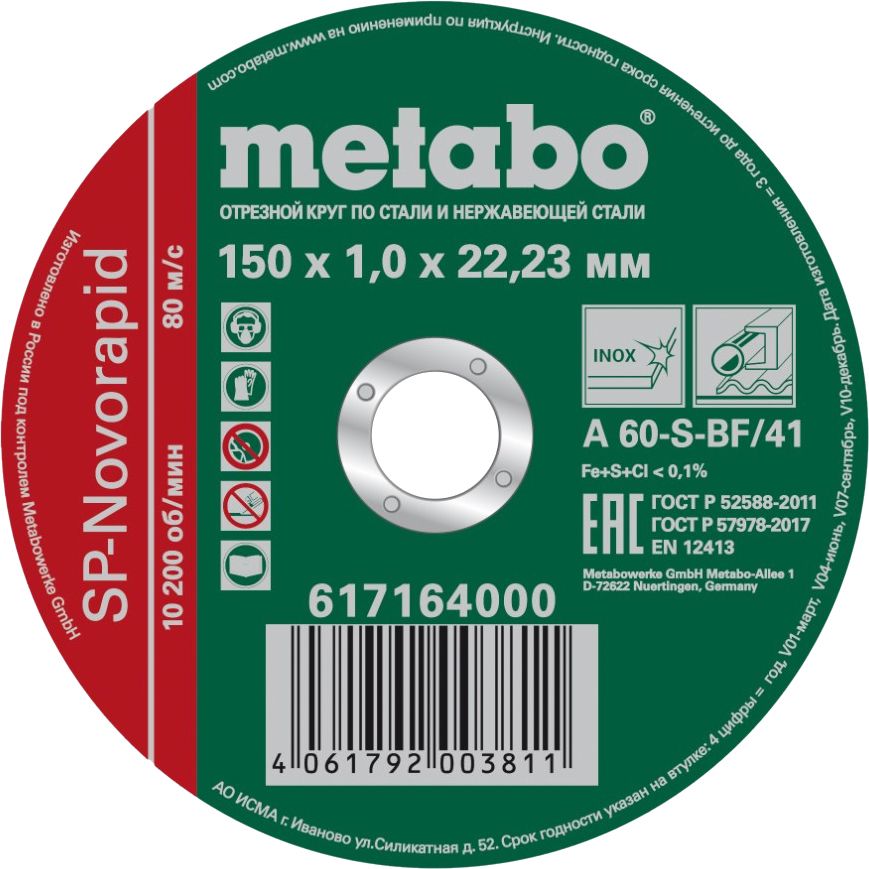 Круг отрезной SP-Novorapid 150х1.0х22 23мм RU нерж. Metabo 617164000 не поставляется, возможно товар снят с производства, по запросу, наши инженеры помогут подобрать аналоги, замены.